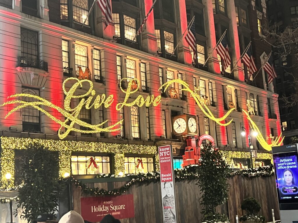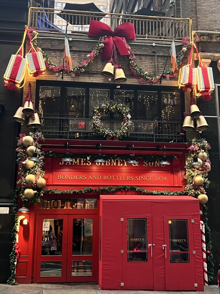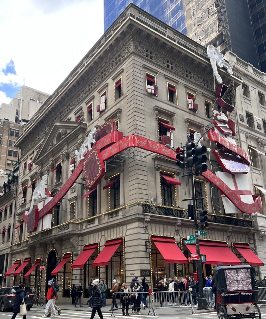 大きなリボンをまとった建物全体やホリデー装飾で、ひときわ目を引きます。